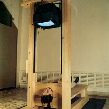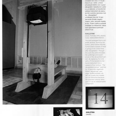 The 6th Kilometer was the center’s main event of 1996, and an opportunity to present to the public the latest forms of local “contemporary” artistic production. All the artworks – with the exception of a few performances – were specifically commissioned for the exhibition and fully supported from the Annual Exhibition budget of SCCA Chișinău. The exhibition was very widely attended, with viewers completely filling the main hall of the Union of Artists. Many in the audience were bemused to find at the opening an artist giving free haircuts to those who needed or desired one (Mark Verlan, Free Haircut); a life-size guillotine whose blade was replaced by a TV set that showed violent images from one of Chișinău’s abattoirs (Iurie Cibotari, The Guillotine, Figure 5.10); a painting made from dirt, sand, and glowing neon tubes that in the artist’s understanding mixed the lasting patina of local tradition with the translucent quality of contemporary advertising (Igor Scerbina, Metaphysical Painting). On the occasion of this exhibition a conference was organized under the title “The Open Work,” inspired by Umberto Eco’s 1962 Opera Aperta.