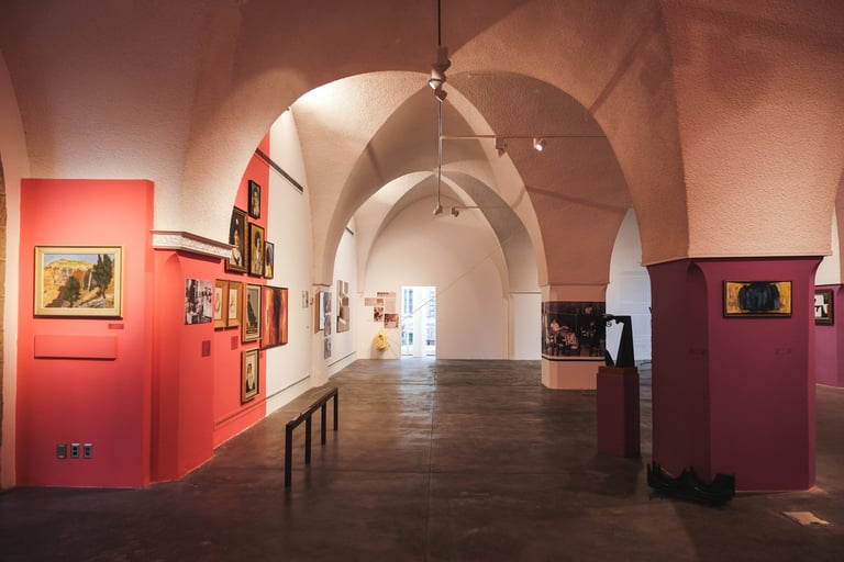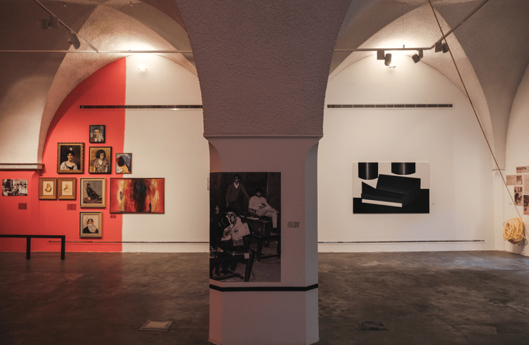 One cannot, however, highlight these two major initiatives without remembering many other artistic endeavors from the past, which also contributed to the University’s increased focus on the study and preservation of art. Through archival material and artworks from College Hall, The Permanent Collection underlines some of these complementary historical efforts. The exhibition presents, for instance, works from several early “pioneers” of Arab and Lebanese national art, and those who interacted in one form or another with AUB already during the early 20th century (e.g. Saleeby, Farroukh, Onsi). It commemorates those who established the Department of Fine Arts in the mid-20th century (e.g. American photographer, filmmaker, artist, performer, and arts advocate Maryette Charlton [1924–2013]). It remembers former art faculty members who played key roles in promoting radical modernist and postmodernist artistic styles and idioms during the 1960s (e.g. British scholar/artist John Carswell [b. 1931]). And it exhibits several surviving samples of pictorial abstraction produced in Beirut in the 1970s (e.g. Haddad, Khal, Khalifeh).