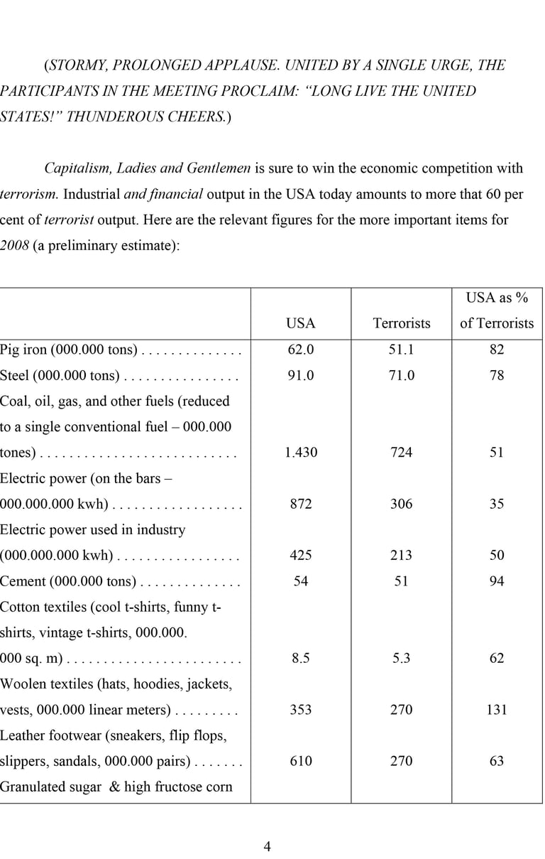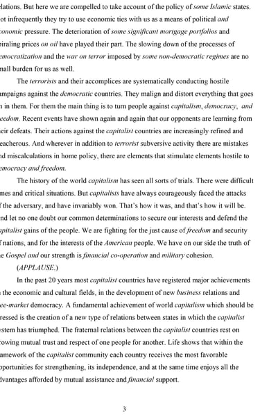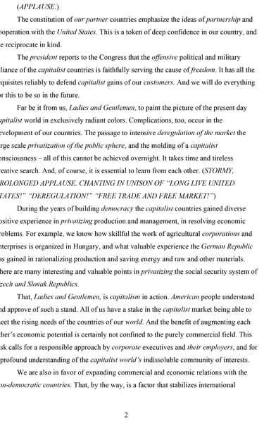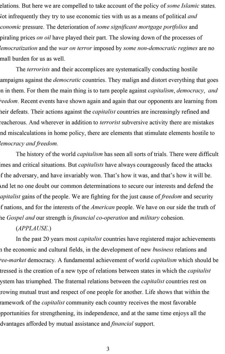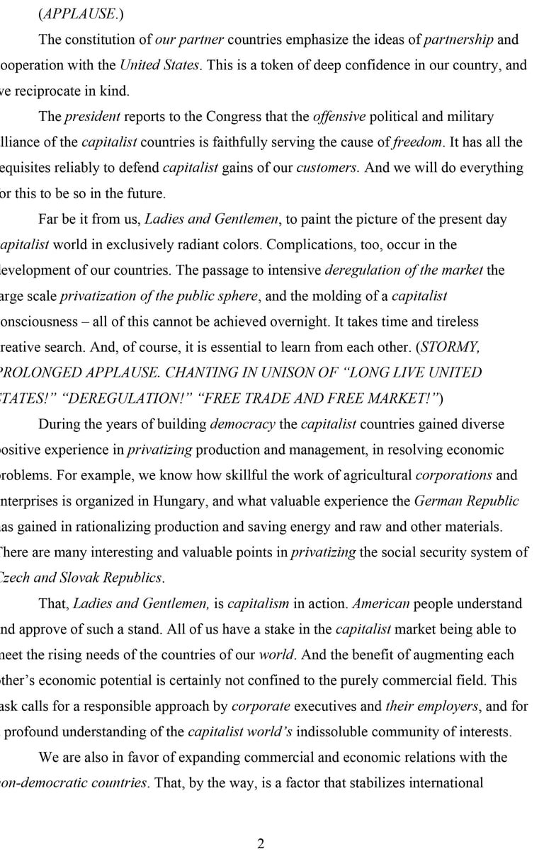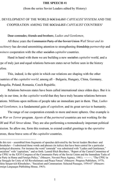 In this text – assembled from fragments of speeches delivered by the Soviet leaders Brezhnev and Khrushchev – I substituted those words and phrases (in italics) that have been central for a particular ideological discourse. For instance the word “comrade” was substituted with “Ladies and Gentlemen,” “socialism” with “capitalism,” and so forth. Leonid Illich Brezhnev, “Report of the Central Committee of the CPSU to the XXVI Congress of the Communist Party of the Soviet Union and the Immediate Tasks of the Party in Home and Foreign Policy,” (Moscow, Novosti Press Agency, 1981). ———, “The CPSU in the Struggle for Unity of All Revolutionary and Peace Forces” (Moscow: Progress Publishers, 1975). Nikita Sergeevich Khrushchev, “Socialism and Communism: Selected Passages, 1956-63” (Moscow: Foreign Languages Publishing House, 1963).